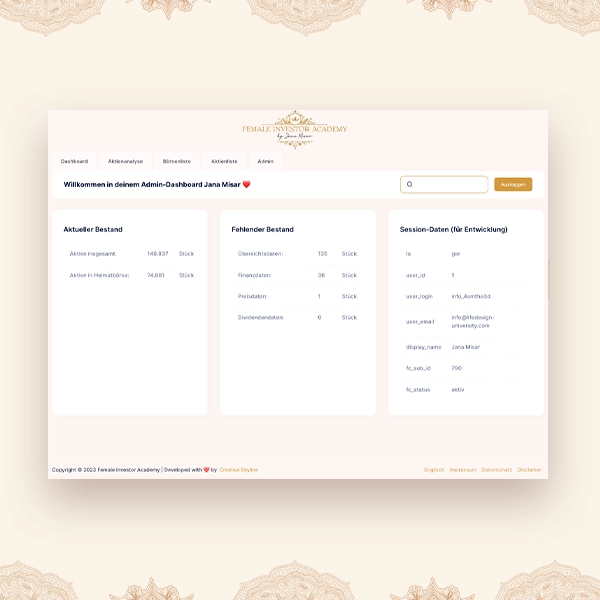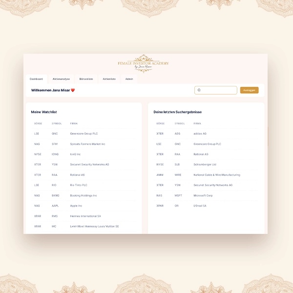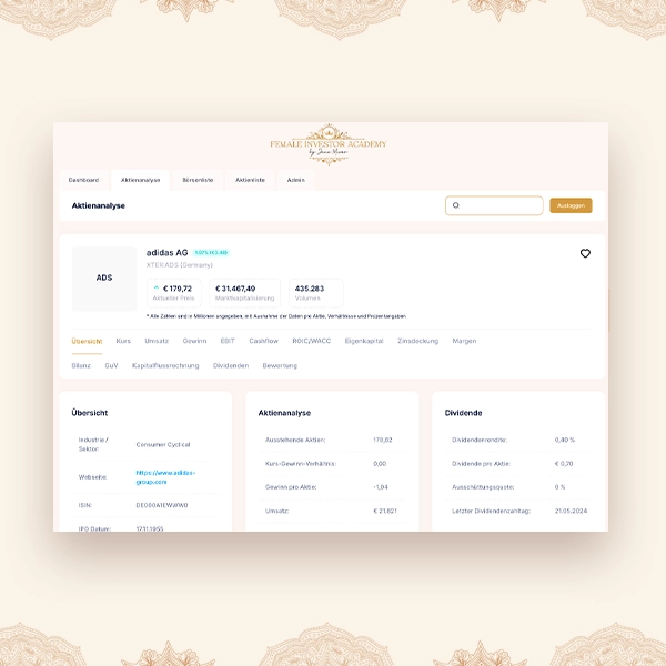 The Female Investor Stock Tool is the first of its kind: a global stock analysis tool specifically designed for women who want to focus on long-term value investing. Offering unique access to global stock markets for a flat rate of just €29 per month, our tool is designed to empower women to achieve financial independence through smart investment decisions based on sound stock analysis.